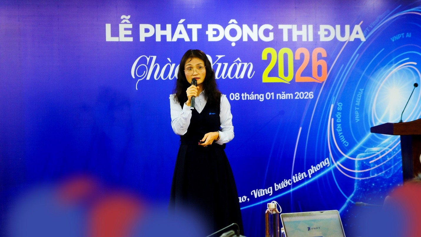 Mở đầu buổi lễ, đ/c Phạm Thị Phương Thảo – Phó Giám đốc VNPT Đà Nẵng đã triển khai nội dung phát động chương trình thi đua “Chào Xuân 2026”, tập trung vào các dịch vụ trọng yếu, công tác số hóa thu cước, với chỉ tiêu cụ thể được giao đến từng địa bàn, từng CBCNV/CTV, làm cơ sở để triển khai đồng bộ và hiệu quả trên toàn đơn vị.